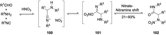 - Mercalli, V.; Nyadanu, A.; Cordier, M.; Tron, G.C.; Grimaud, L.; El Kaim, L. N–N bond formation in Ugi processes: From nitric acid to libraries of nitramines. Chem. Commun. 2017, 53, 2118–2121. [Google Scholar] [CrossRef] [PubMed]