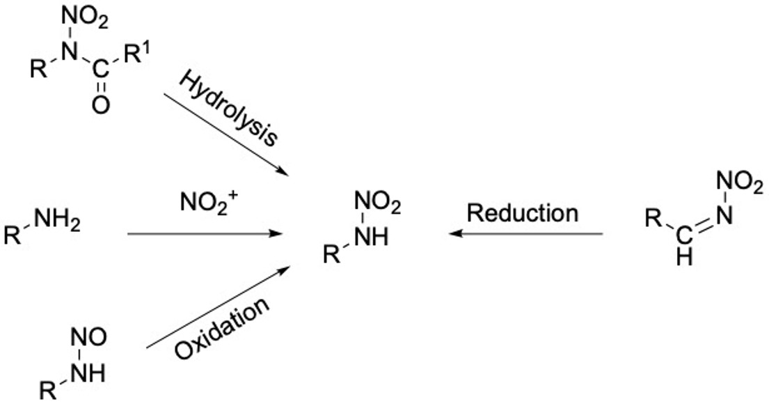 Finally, oxidation of nitrosamines and reduction of nitroimines occupy more specialized niches. These strategies are especially useful when nitrosamines or nitroimine precursors arise naturally or are easily prepared, enabling efficient access to certain nitramines, but their broader applicability has so far been constrained by precursor availability and safety considerations. Moreover, this type of strategy can have special relevance for preparation of reference compounds for atmospheric and environmental studies, where such intermediates are readily accessible and closely related to real degradation pathways.