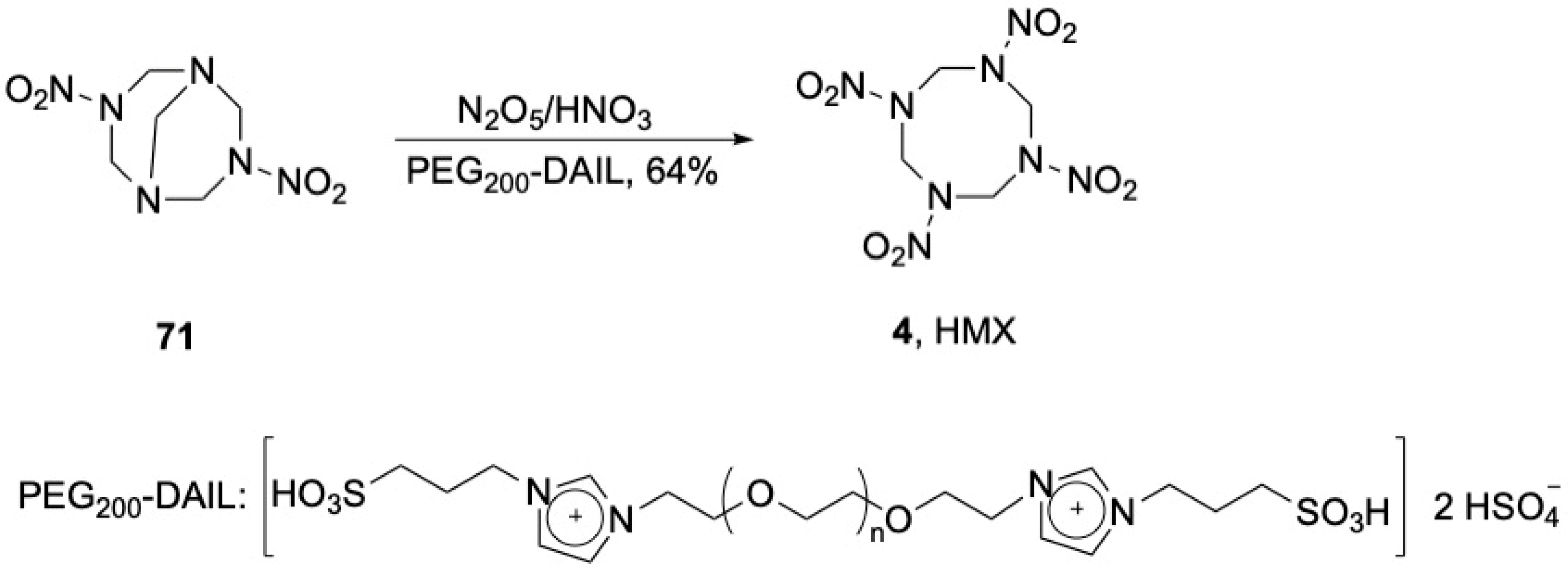 Nitric acid/acetic anhydride with either chloride ion catalyst or chloramine has been used in various syntheses of explosives, such as N-nitrodiethanolamine dinitrate (DINA) [51,54,55]—including a continuous-flow synthesis of DINA [56], n-Butyl nitroxyethylnitramine (BuNENA) [57], and triethylenetetranitramine (TETN) [58].