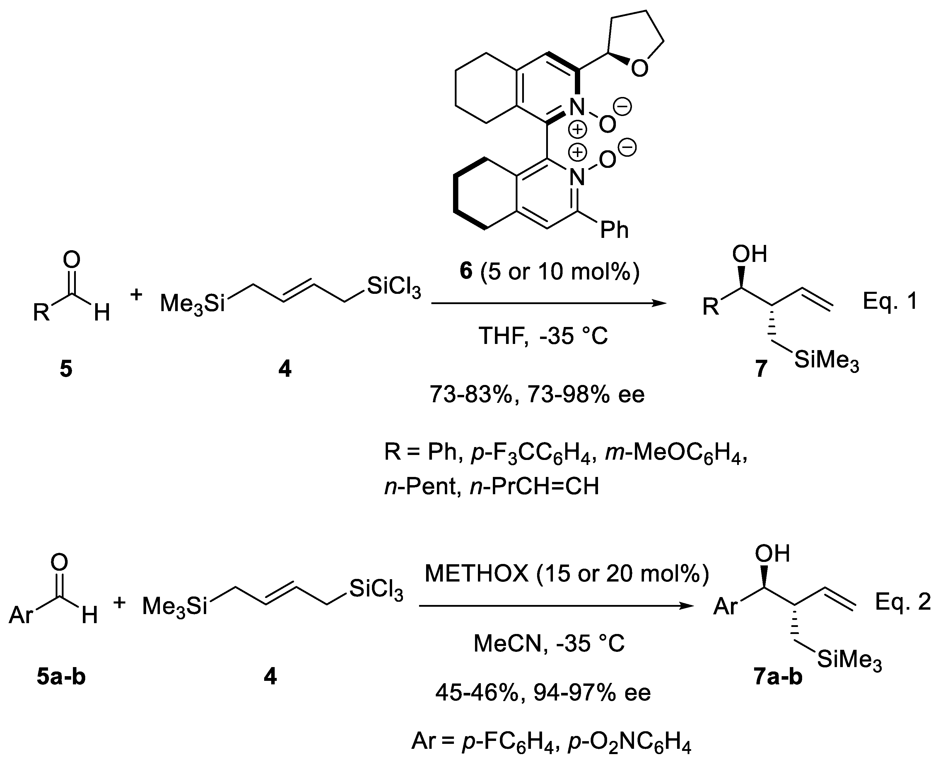 - Malkov, A.V.; Bell, M.; Castelluzzo, F.; Kočovský, P. METHOX: A New Pyridine N-Oxide Organocatalyst for the Asymmetric Allylation of Aldehydes with Allyltrichlorosilanes. Org. Lett. 2005, 7, 3219–3222. [Google Scholar] [CrossRef]