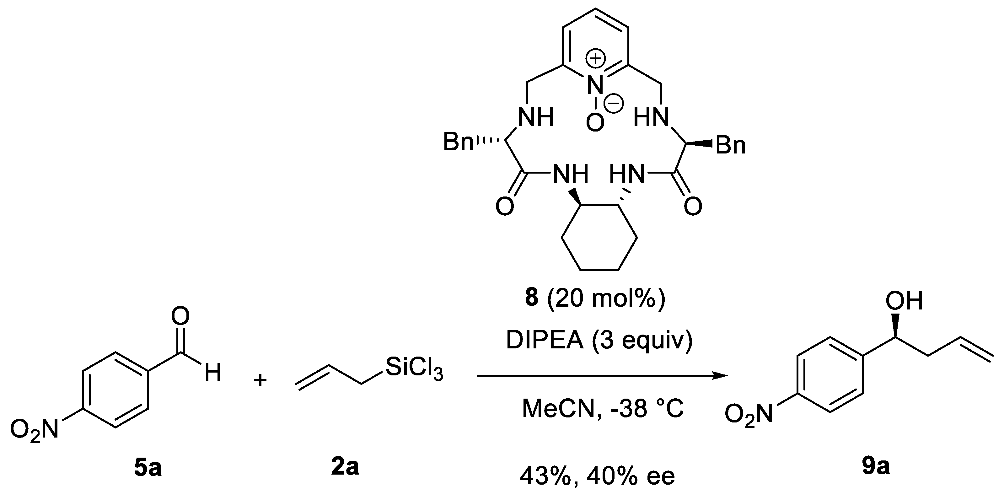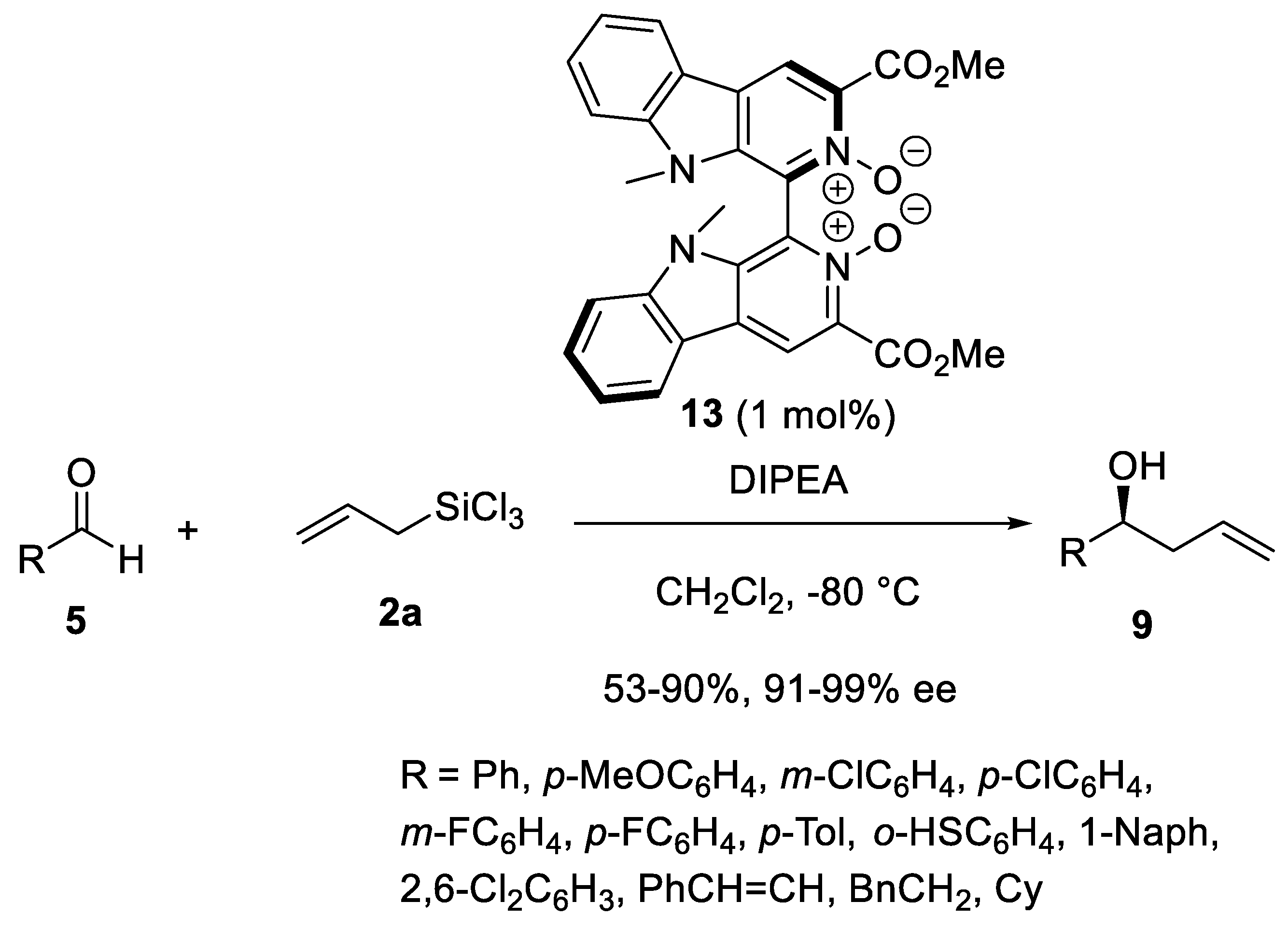 - Malkov, A.V.; Stoncius, S.; Bell, M.; Castelluzzo, F.; Ramirez-Lopez, P.; Lada Biedermannova, L.; Langer, V.; Rulisek, L.; Kočovský, P. Mechanistic Dichotomy in the Asymmetric Allylation of Aldehydes with Allyltrichlorosilanes Catalyzed by Chiral Pyridine N-Oxides. Chem. Eur. J. 2013, 19, 9167–9185. [Google Scholar] [CrossRef]