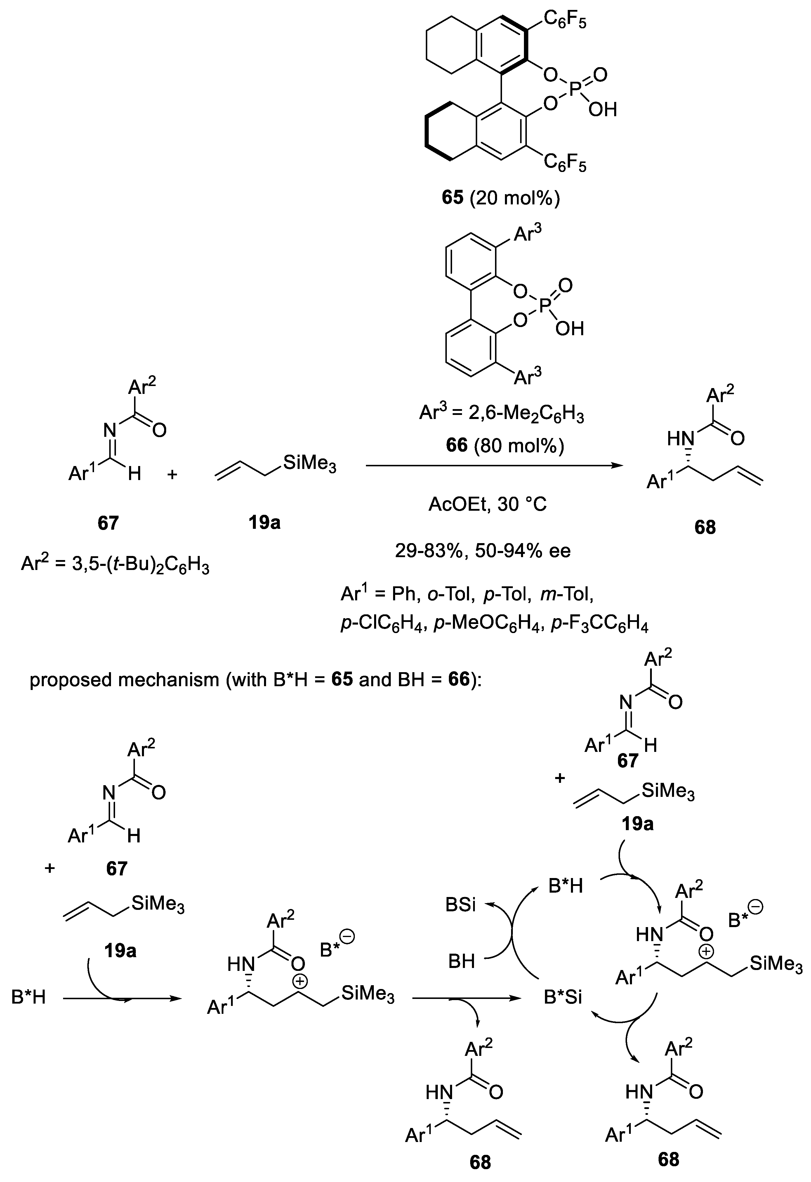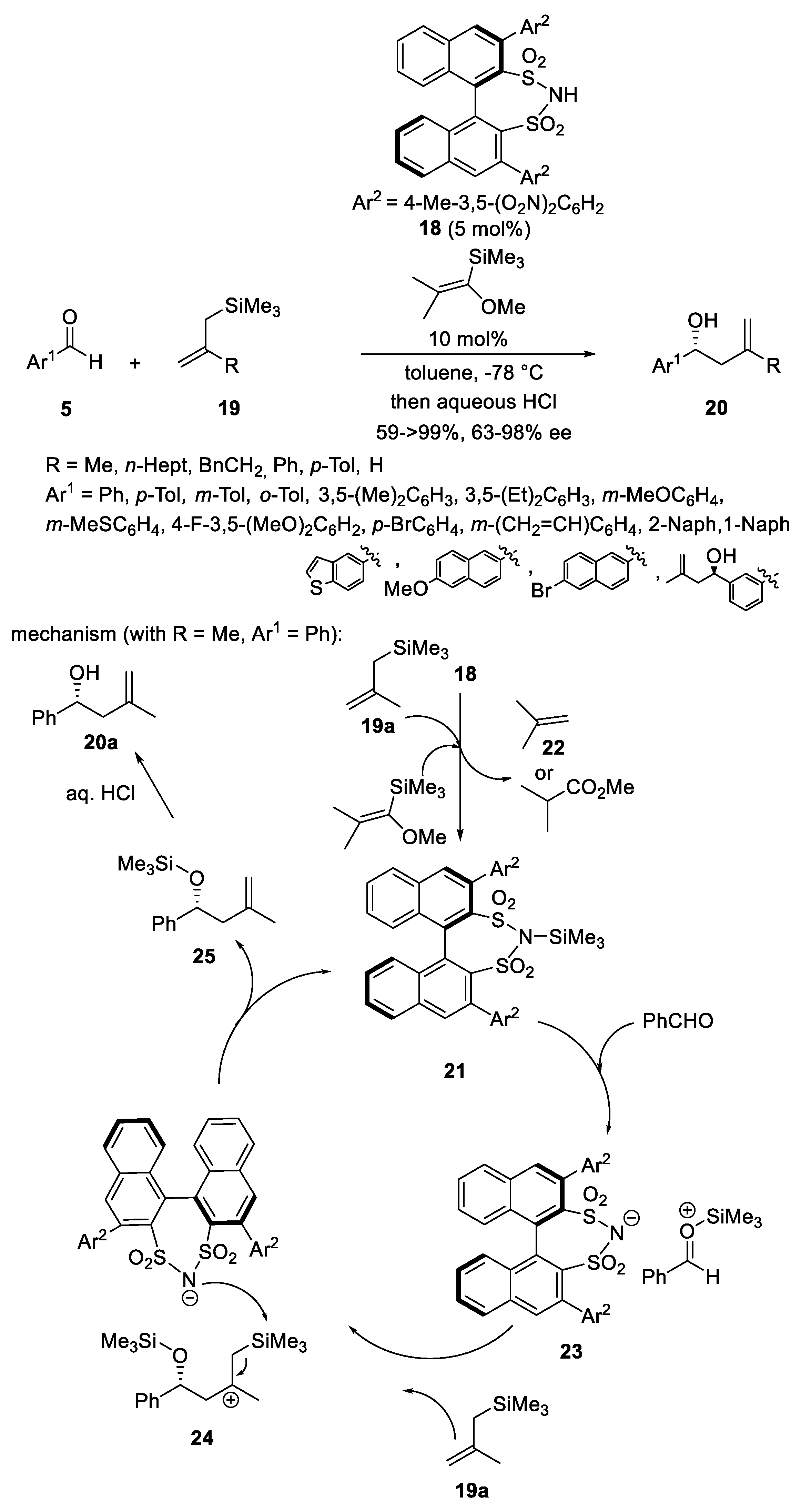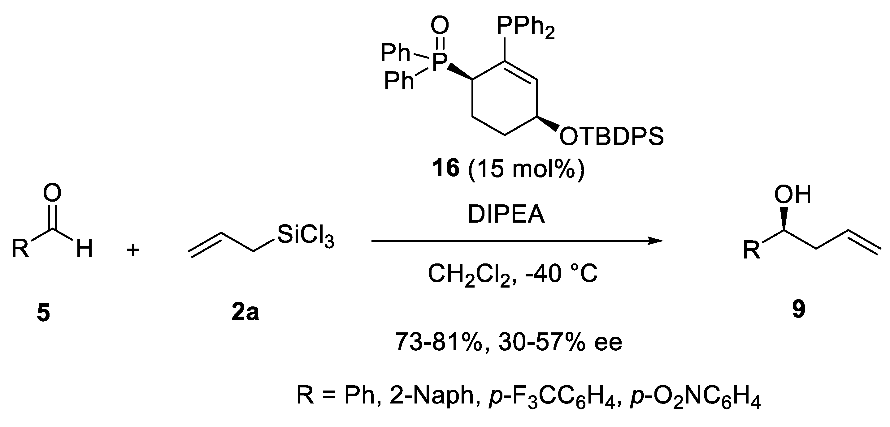- Kaib, P.S.J.; Schreyer, L.; Lee, S.; Properzi, R.; List, B. Extremely Active Organocatalysts Enable a Highly Enantioselective Addition of Allyltrimethylsilane to Aldehydes. Angew. Chem. Int. Ed. 2016, 55, 13200–13203. [Google Scholar] [CrossRef] [PubMed]