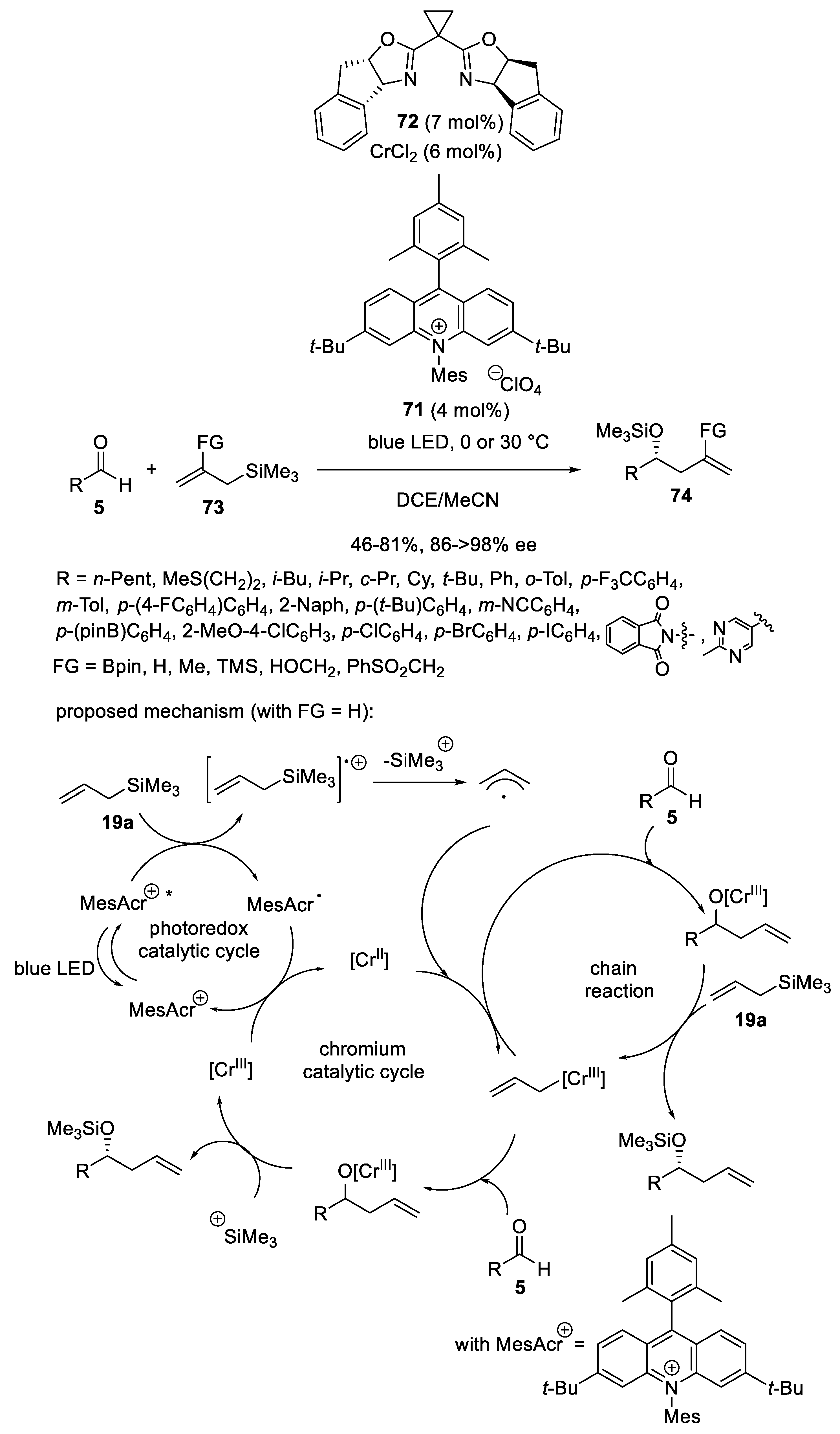 - Schäfers, F.; Dutta, S.; Kleinmans, R.; Mück-Lichtenfeld, C.; Glorius, F. Asymmetric Addition of Allylsilanes to Aldehydes: A Cr/Photoredox Dual Catalytic Approach Complementing the Hosomi–Sakurai Reaction. ACS Catal. 2022, 12, 12281–12290. [Google Scholar] [CrossRef]