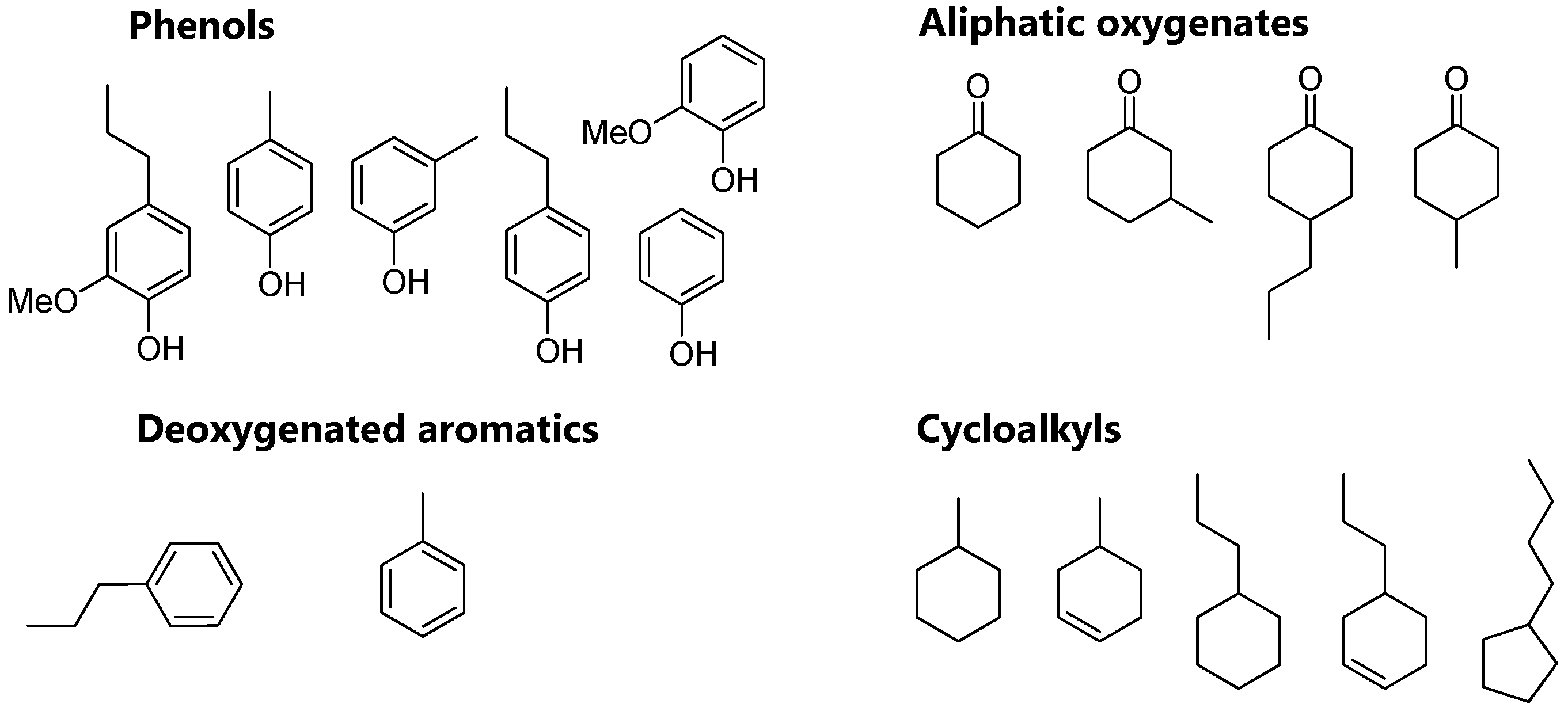 - Zhao, C.; He, J.; Lemonidou, A.A.; Li, X.; Lercher, J.A. Aqueous-phase hydrodeoxygenation of bio-derived phenols to cycloalkanes. J. Catal. 2011, 280, 8–16. [Google Scholar] [CrossRef]