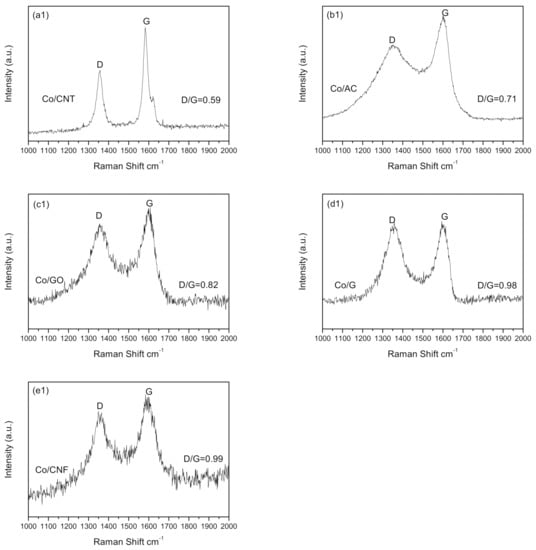 Raman spectroscopy results of different carbon-supported cobalt catalysts. (a1): Co/CNT, (b1): Co/AC, (c1): Co/GO, (d1): Co/rGO, (e1): Co/CNF.