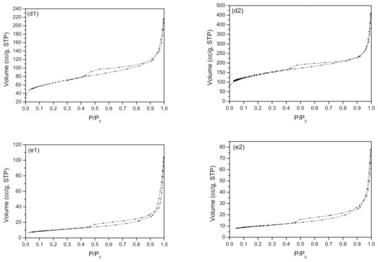 Nitrogen adsorption-desorption isotherm of (a1): Co/CNT, (a2): CNT, (b1): Co/AC, (b2): AC, (c1): Co/GO, (c2): GO, (d1): Co/rGO, (d2): rGO, (e1): Co/CNF, (e2): CNF.