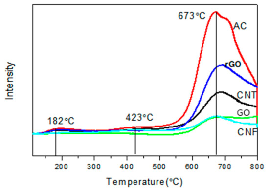 The NH3-TPD technique was used to measure the surface acidity of the as-prepared catalyst samples. As shown in Figure 9, three peaks at about 180, 423, and 673 °C correspond to the weak acid site, medium and strong acid sites, respectively [28,29,30,31]. Previously reported work by Wang et al. [32] suggested that the strong acid sites can improve the cobalt metal dispersion, leading to the formation of reduced cobalt oxide particle size. The acid site can promote the cobalt oxide reduction to metallic cobalt, which in turn, is beneficial to the catalyst performance. In brief, Figure 9 shows the strong acid site of all five types of catalysts increase in the order of Co/AC, Co/rGO, Co/CNT, Co/GO, and Co/CNF. The sample of Co/AC also shows the highest peak of weak acid, followed by Co/rGO and Co/CNT.