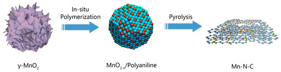 Figure 1 shows the synthesis route where MnO2 nanosheets were first prepared using a precipitation method, followed by in-situ polymerization of aniline to form a MnO2-x/PANI composite (the chemical state of Mn4+ may change to lower valence states during oxidation polymerization of aniline, thus this is labeled as MnO2-x). After pyrolysis in argon gas, a Mn-N-C nanostructure was generated.
