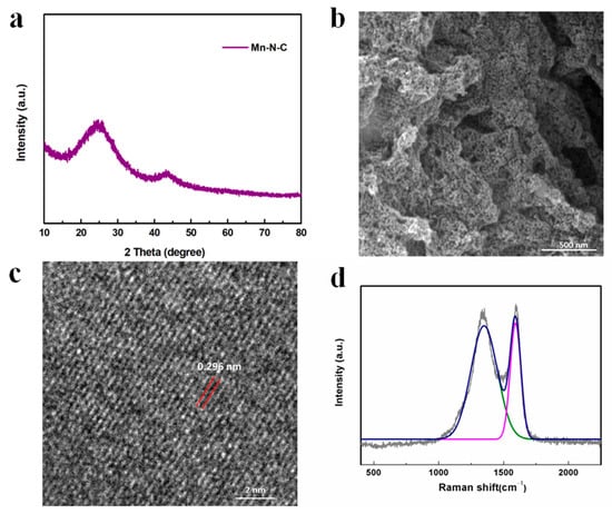 (a) XRD pattern; (b) SEM image; (c) HRTEM image; (d) Raman spectrum of Mn-N-C nanostructure.
