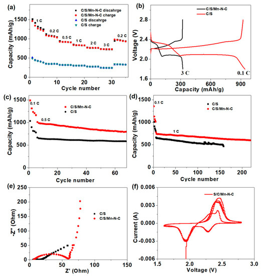 Li-S batteries were assembled with traditional electrodes (denoted as C/S) and electrodes containing 10 wt % Mn-N-C (denoted as C/S/Mn-N-C), and the rate performance was first investigated under different current densities ranging from 0.1 to 3 C (Figure 7a). At rates of 0.1, 0.2, 0.5, 1.0, 2.0 and 3.0 C, reversible capacities of Li-S batteries using C/S/Mn-N-C as the electrodes were preserved at 1319.4, 1080.2, 922.1, 834.4, 765.0 and 729.8 mAh g−1, respectively. When the current density recovered to 0.2 C, the cell still delivered a high reversible capacity of 945.2 mAh g−1. In sharp contrast, the capacities of the cell with the C/S electrode ranged 500~700 mAh g−1 lower than those of the C/S/Mn-N-C electrode at corresponding rates. The charge-discharge voltage profiles of the cell with the C/S/Mn-N-C electrode exhibited much higher reversible capacities at different rates than those of the pure C/S electrode, and the capacity difference mainly derived from the prolongation of the lower-voltage plateau (2.05 V) (Figure 7b). Specifically, the maximum capacity of 1319.4 mAh g−1 achieved at 0.1 C in this work outperformed other carbon cathode materials at similar conditions, such as 1230 mAh g−1 at 0.1 C for N,S-co-doped carbon [59], 897.1 mAh g−1 at 0.5 C for N-doped carbon nanotubes [60], 1090 mAh g−1 at 0.2 mA g−1 for acetylene black/S/polypyrrole [61] and 1200 mAh g−1 at 167.5 mA g−1 for S/C derived from phenolic resin [62]. In addition, the plateau-voltage gap of the C/S/Mn-N-C electrode (150 mV) was smaller than S/C (200 mV). The results indicate that Mn-N-C possessed a better catalytic effect on the conversion of short-chain sulfides (Li2S2/Li2S). The cycling performance of the Li-S cells with different electrodes was also examined at a current density of 0.5 C. The cell with the C/S/Mn-N-C electrode preserved a capacity of 806.3 mAh g−1 after 60 cycles, which was much higher than that of the C/S electrode (579 mAh g−1) (Figure 7c). Even when the current density was increased to 1 C, the cell with the C/S/Mn-N-C electrode still delivered a maximum capacity of 744.3 mAh g−1 with a high-capacity retention ratio of 80.6% after 220 cycles. In comparison, the maximum capacity for the C/S electrode was only 658.5 mAh g−1 and the capacity retention ratio was only 69.1% (Figure 7d). The results of the cyclic performance demonstrated that Mn-N-C could greatly improve the reversible capacity and cyclic stability. The compatibility of electrodes was investigated by electrochemical impedance spectroscopy (EIS) (Figure 7e). When Mn-N-C was introduced into the electrode, the interface impedance slightly increased, indicating the composition was good between Mn-N-C and C/S. Meanwhile, the lower semi-infinite Warburg impedance in the low-frequency regions suggested a faster mass transfer in the Mn-N-C electrode [63]. The reaction kinetics were further studied by the cyclic voltammogram (CV), only one pair of redox peaks appeared with a peak interval of 0.13 V for the cell with the C/S/Mn-N-C electrode (Figure 7f). The CV results with a small interval indicated the Mn-N-C possessed a good reversibility for the conversion of polysulfides.
