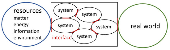 The concept of information systems involving inputs and outputs is widely used in science, technology, and society [1]. Inputs are defined as signals or data received by a system, whereas outputs are defined as signals or data sent from it [2]. Inputs represent data and materials from external processes, and outputs are data and materials flowing out of transformation processes [3]. In other words, inputs for a system cause change, whereas the effects that occur on a system are outputs. Interfacing connects an input/output system to another [4,5,6] and facilitates the designing or adaptation of the outputs and inputs of two systems, enabling them to work together [7]. Overall, resources, such as materials, energy, information, and environment, are interfaced by a number of input/output systems leading to functions in the real world (Figure 1) [1]. For instance, an air conditioner controls room temperature, which involves the monitoring of environmental temperature, interfacing of electronic device input/output systems, and conducting heating and cooling functions.
