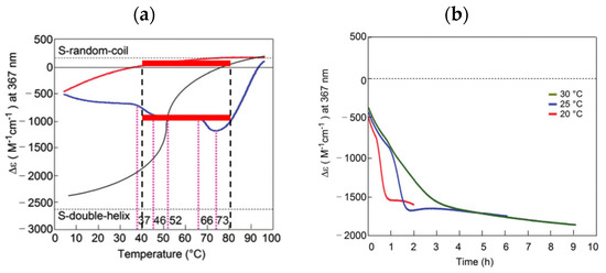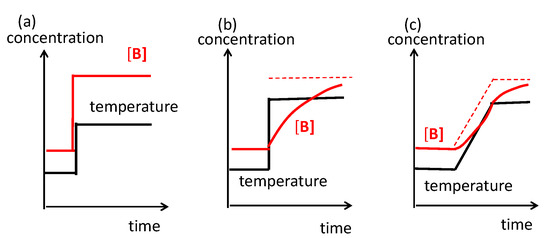When delay occurs in a chemical reaction in response to a stepwise temperature change, the system moves away from chemical equilibrium, and transient delay phenomena occur when the reactions approach chemical equilibrium (Figure 3b). Note that delay phenomena occur out of chemical equilibrium, which is in contrast to chemical equilibrium without delay (Figure 3b, compare red dashed line). The reaction rate −d[A]/dt = k[A]2 of the irreversible bimolecular chemical reaction 2A→B is described according to the chemical kinetics based on transition state theory [34,35]. The rate constant is expressed by k = A exp(−Ea/RT), in which A, Ea, R, and T are frequency factor, activation energy, gas constant, and absolute temperature, respectively. The reaction rate under constant temperature (isothermal) conditions against a stepwise temperature change is described by the change of k according to the equation. A 10 °C increase in temperature is considered to increase the initial reaction rate two- to three-fold under ambient conditions. This phenomenon implies that temperature change induces a small change in the concentration of B at the initial stage of the chemical reaction, at which the conversion or the concentration of B is extremely low. Small increases in concentrations under ambient conditions may be difficult to interface, and thermal input/concentration output systems with high sensitivity to temperature changes are used in biological cells.