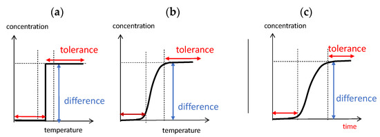 Sigmoidal relationship exhibits S-shaped curves and can be an experimental analog to the Heaviside relationship (Figure 5b). The concentration in a sigmoidal relationship in a temperature/concentration profile can be characterized, for example, by temperature T with Ta/(1 + Ta) involving a positive constant a or the Hill coefficient in biology [44,45]. Sigmoidal relationship provides two limit states with flat domains at different temperatures, and these states provide tolerance to small temperature perturbations. Such stability is especially important when limit states are metastable or out of equilibrium. Otherwise, temperature perturbations readily exert effects that changes the metastable limit states toward chemical equilibrium.
