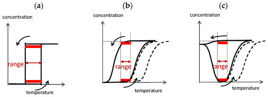 Bistability by thermal hysteresis involving (a) the Heaviside step relationship, (b) and (c) sigmoidal relationships shown by temperature/concentration profiles. Bold red lines indicate the temperature ranges of bistability with tolerance. Dashed lines indicate the examples of chemical equilibrium. Black arrows indicate cooling and heating.