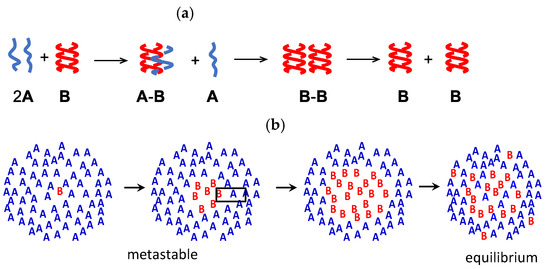 B in a closed system is described as follows. At a high temperature, 2A is thermodynamically stable, and dissociation reaction B→2A occurs, the process of which is out of chemical equilibrium when delay against the temperature changes is involved [32,33,34]. At a low temperature, the relative thermodynamic stability inverts, and B becomes thermodynamically stable. Then, association reaction 2A→B occurs with delay, which proceeds towards chemical equilibrium. The reversible chemical reaction 2A