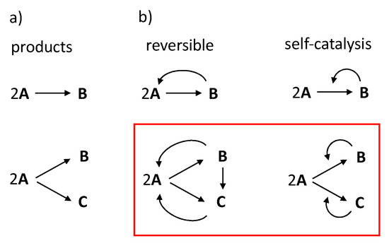 (a) Ordinary competitive chemical reactions 2A→B and 2A→C, and (b) reversible competitive chemical reactions B