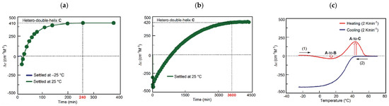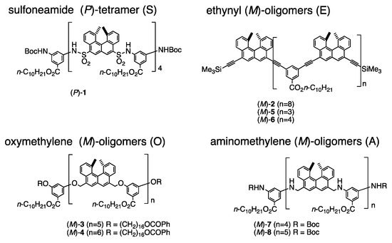 - Shigeno, M.; Kushida, Y.; Yamaguchi, M. Molecular thermal hysteresis in helix dimer formation of sulfonamidohelicene oligomer in solution. Chem. Eur. J. 2013, 19, 10226–10234. [Google Scholar] [CrossRef] [PubMed]