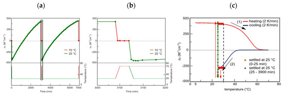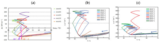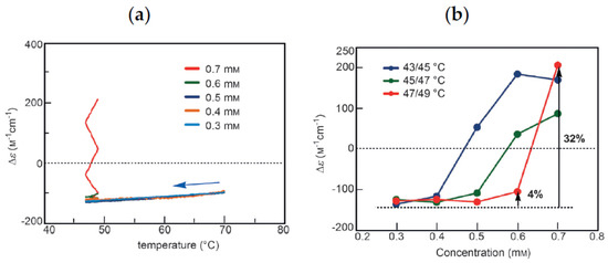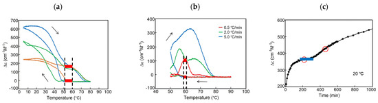 Various types of thermal hysteresis can appear, which are also explained by sigmoidal relationships and bistability [29,30,31]. For example, consider a thermal hysteresis with a small decrease in concentration during cooling and significant decrease and increase during heating (Figure 6c), which will be noted in Section 5.2. The phenomena can be interpreted by the involvement of three sigmoidal relationships, one during cooling and two during heating, and bistability occurs at the same temperature range (Figure 6c, red bold lines). This is in contrast to the above-mentioned thermal hysteresis (Figure 6b), in which two sigmoidal relationships are involved during cooling and heating. The two/three sigmoidal relationships provide phenomena out of chemical equilibrium (Figure 6c, compare dashed lines).