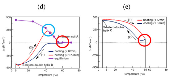 B occurs in a different pathway in the formation of 2A and B by heating and cooling, respectively. Accordingly, two states appear at the same temperature, range which is bistability. When stepwise temperature change is provided, the pathway with delay can be described by chemical kinetics under isothermal conditions, which are expressed by concentration/time profiles (Figure 3b) [32,33,34]. When temperature is gradually changed, the different pathways with delay are expressed by thermal hysteresis in concentration/temperature profiles. Such reversible chemical reactions are in contrast to chemical equilibrium, in which no delay occurs during cooling and heating (Figure 3a).