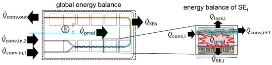 Using local heat balances, the individual conversions inside twelve reactor elements are obtained. The energy balance of a respective SE is stated in Equation (1), where is the change of energy over the time in the system under consideration.