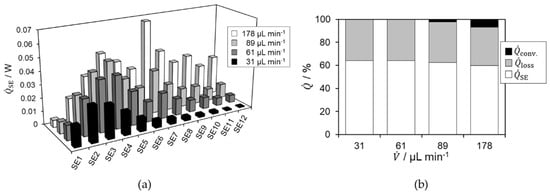In general, an initially increasing and subsequently decreasing heat flux profile is observed. An exception is the measurement at 178 µL min−1. There, a further increase can be seen above SE7, followed by a decreasing but fluctuating drop in the profile towards the reactor outlet. In addition, higher amplitudes of heat fluxes are observed for higher volumetric flow rates. As the volumetric flow rate increases, the maximum possible released heat of reaction also increases according to Equation (3). Consequently, the individual signals of the Seebeck elements also increase. The increase above SE7 is due to a larger projection area and the bend in the reaction channel, which is located above SE7. The centrifugal forces inside the bend lead to a sudden enhancement in mixing []. This leads to a peak in conversion and heat release. With increasing heat release, the reaction rate also increases again, which is why the measured signals are comparatively high []. The fluctuations beyond SE7 can be explained by an insufficient steady state during the of measurement. For 178 µL min−1, a strong peak and higher heat generation can be observed in the residence time section of the reactor, indicating incomplete conversion.