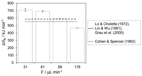 Determined reaction enthalpy from the experiments for the respective flow rates and comparison with literature [,,,].