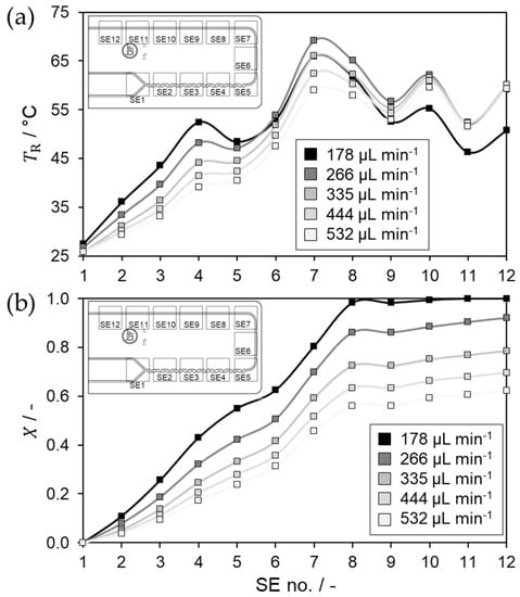 In general, it can be seen that the temperature profile does not differ considerably between the different volume flow rates. This is probably due to the mixing behavior, which is identical for all investigated flow rates, as stratified flow regime is observed []. However, balancing of the individual SEs leads to irregularities within the temperature profile. These can be observed at SE5 shortly after the mixing section and in the residence channel section from SE8 to SE12 towards the reactor outlet. The downward deviation at SE5 is probably due to two points. Firstly, the thermal resistances are estimated for the respective heat transfer direction. Among other things, constant thermal conductivities are assumed at 25 °C for glass, PMMA, and the SE. Since the local reactor temperature is in some cases above 65 °C and locally possibly even higher, this can lead to deviations. Secondly, the averaging of the reactor temperature above one SE itself can also lead to considerable deviations. The assumption of a constant reactor temperature, which is determined by averaging reactor in- and outlet temperature above the respective SE, therefore influences the determination of the kinetic constant and thus the reliability of the kinetic data. However, precise measurement of local reactor temperature in any number of locations is not possible in the microreactor system, or is associated with very high costs. The precision of the reactor temperature estimation can be increased by higher flow rates, which reduces the residence time above a compartment minimizing the error of temperature averaging. In addition, the concentration can be reduced to decrease the possible heat release and consequently the temperature differences within a compartment. Overall, a compromise must be made between residence time, the resulting conversion, and the amplitude of the measurement signals of the SEs, which decreases for low conversions. The increase from SE11 to SE12 is due to a set condition that the outlet temperature above SE12 must correspond to the measured outlet temperature measured within the stream.