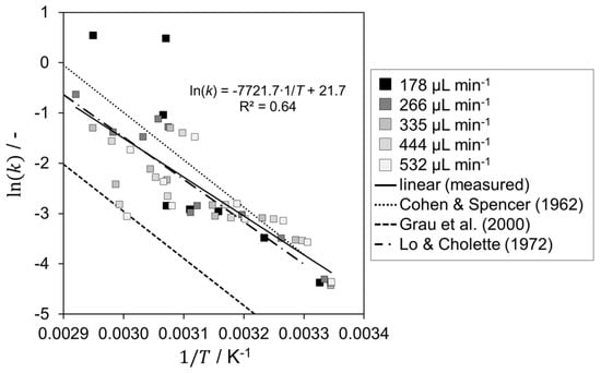 Using the compartment modelling approach, five automated runs resulted in 48 data points for the Arrhenius plot. The activation energy was determined to be 62.2 kJ mol−1 and the frequency factor to be 2.6 × 109 L mol−1 s−1. The deviation of the activation energy from the literature values is −6.3% [,] and 16.3% [,], respectively. In general, the calculated kinetic parameters are in the range of the literature values. The only exceptions are the two outliers at a flow rate of 178 µL min−1 and at high temperatures. The deviations here are probably due to the determination using the thermal conversion. When determining the enthalpy of reaction, it was assumed that there was no complete conversion for this volume flow rate. However, the compartment modelling approach shows here that complete conversion is achieved after SE7. Thus, it is reasonable to assume that the reaction rate is overestimated. A possible explanation could be side reactions with high heat release. However, the kinetic parameters determined agree quite well with those of Cohen & Spencer [] and Lo & Cholette [].