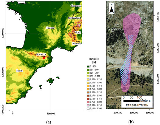 General location (red point) of the Coll de Pal pass (background image source: ESRI) (a). Representation of the potential release, runout and deposition area RIT051 (magenta polygon) where avalanches generally occur (as it was stored in the BDAC [32,33,34]), and recorded runout and deposition area of the event (blue stripped polygon) (background image source: Institut Cartogràfic i Geològic de Catalunya (CC by 4.0)) (b).