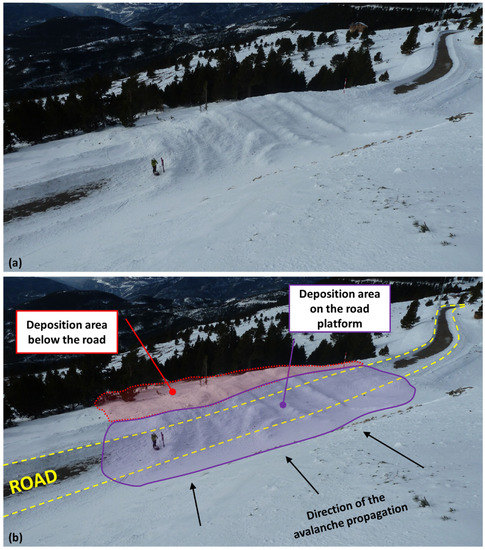 Inspection revealed that the avalanche was potentially triggered at an elevation of around 2145 m.a.s.l., and stopped several meters below the road, at 1930 m.a.s.l. Only the runout and deposit areas were mapped (Figure 1b, blue polygon) because of the difficulties with accessing the release area. Some snow depth proofs were performed on the road revealing a mean depth of 1.5 m and a maximum of 2.5 m at the west side. The affected length was estimated in 370 m with vertical drop of 215 m. The avalanche volume was not larger than 2500 m3. According to the European Avalanche Warning Services classification [37], this is an avalanche size 2+ (medium plus).