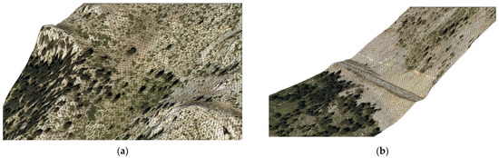 Three-dimensional view of the calculation mesh of the numerical model: (a) release area; (b) slope change due to the road (background image source: Institut Cartogràfic i Geològic de Catalunya (CC by 4.0)).
