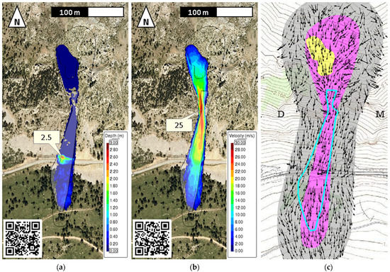 The simulation was carried out assuming a 20-year return period. According to the recommendations of Bartelt et al. [65], the involved parameters for the rheological model were 0.34 for , 1250 m/s2 for , and 100 Pa for . Simulated results were compared to the observations.