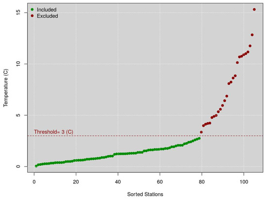 Figure 1 shows a qq-plot of the yearly RMSE statistics between the valid stations. The dotted red line represents the maximum threshold (3 °C) value from which the average of the 101 WU stations can deviate from the mean temperature of the METARs stations to be included, otherwise excluded. The green points represent the included WU stations, while the reds the excluded WU stations (because they showed a mean annual temperature that deviates more than 3 °C from the threshold). According to the threshold shown in this figure, 17 stations were eliminated (red dots) as also explained in 4b.