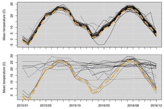 WU data quality control—Mean temperature of PWSs. In both the graphs, the black lines represent the mean temperatures of the PWSs, while the dashed yellow line represents the mean temperature of the four METARs stations. The upper graph shows the stations represented with the green points in Figure 1 (mean within the threshold); while the lower graph shows the stations represented with the red points in Figure 1 (mean higher than the threshold).