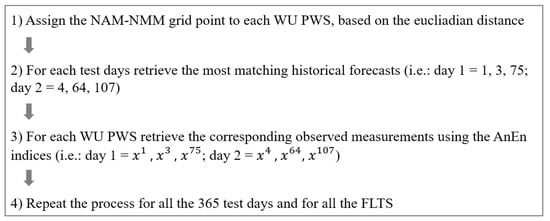 Once the analogs for the NAM-NMM point are generated, the spatial downscaling process is executed by reusing the AnEn indices and assigning them to the corresponding time steps of each of the 83 observations’ locations that are the target stations to which the analogs will be downscaled to. The downscaling is run for all the 365 test days and for all the FLTs, generating downscaled analog predictions results over the entire domain area, and over the entire test period (see Figure 5 for a summary of the main steps).