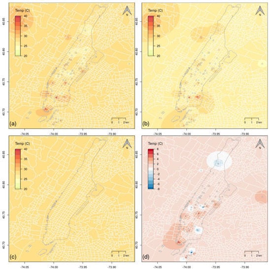 The proposed method was tested in the Manhattan Borough of New York, New York, which was chosen because of the very high population density, paired with a large number of available weather stations. Current estimates give a population of more than 1,600,000 inhabitants in the Manhattan Borough of New York (https://www.census.gov/quickfacts/newyorkcountymanhattanboroughnewyork (accessed on January 2021)). The United States Environmental Protection Agency (EPA) suggests that annually the average temperature of a city counting 1 million or more can be 1–3 °C warmer than the surrounding areas, and with up to a 12 °C difference during the evening hours (https://www.epa.gov/heatislands (accessed on January 2021)).