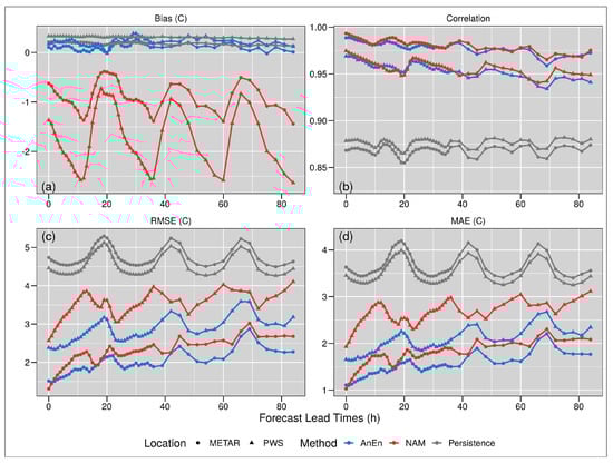 The (d) panel shows the MAE. It is an error that is represented by the average of the absolute differences between forecasts and observations. The perfect score is 0. The downscaled AnEn for the METARs stations shows an average value equal to 1.52 °C, while for the other PWS reports an average value equal to 2.02 °C; the NAM-NMM model shows for the METARs stations an average MAE of 1.76 °C, and a value of 2.65 °C for the other PWSs. The Pers reports a MAE of 3.665 °C for the METARs stations and a 3.494 °C value for the all the other PWSs. Additionally in terms of MAE, the AnEn performs better than the Pers and the NAM-NMM model, showing a worse performance that increase over the prediction time.