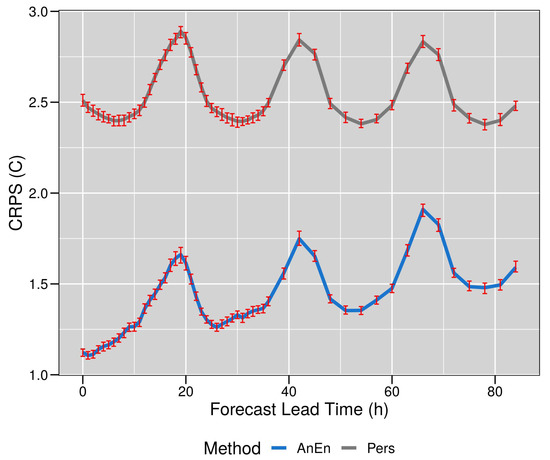 The red error bars represent the 95% confidence interval for the mean difference calculated by performing a bootstrap resampling. The mean CRPS value for AnEn is equal to 1.41 °C, while for the Pers the value equals to 2.54 °C.