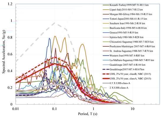Response spectra (damping ratio of 5%) of selected recorded accelerograms and Uniform Hazard Spectra (UHS) for site classes A and B (National Building Code of Canada (NBCC) 2015).
