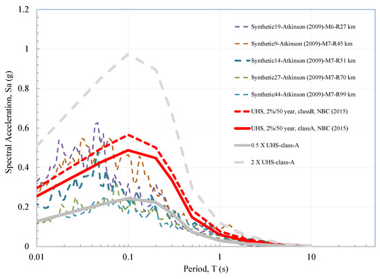 Response spectra (damping ratio of 5%) of synthetic accelerograms for hard rock site condition proposed in [33] and UHS for site classes A and B (NBCC 2015).