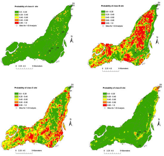 Locations of the 12 representative sites on the probabilistic microzonation maps derived from the method proposed by Talukder and Chouinard [35] for site classes A, B, C and D.
