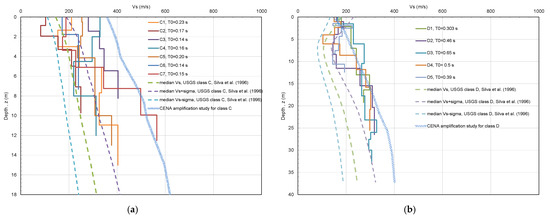 (a) Vs profiles for selected class D, and (b) Vs profiles for selected C sites in Montreal compared with the median Vs profiles from Silva et al. [36] and the median Vs profile for Central and Eastern North America (CENA) sites [37].