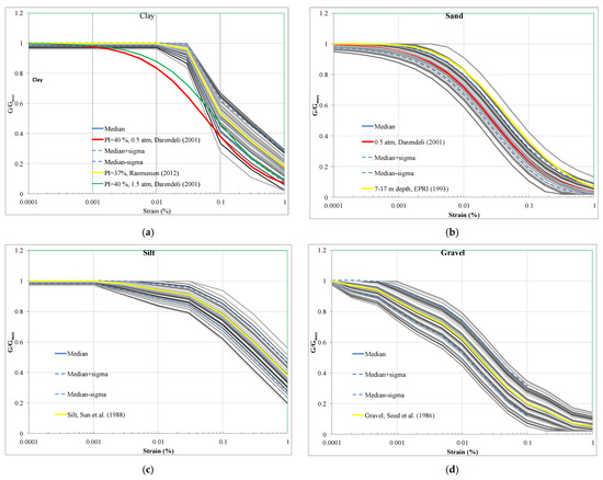 Randomized G/Gmax and strain (%) curves for (a) clay, (b) sand, (c) silt, and (d) gravel. The curves in gray in the above figures are generated from the randomization.