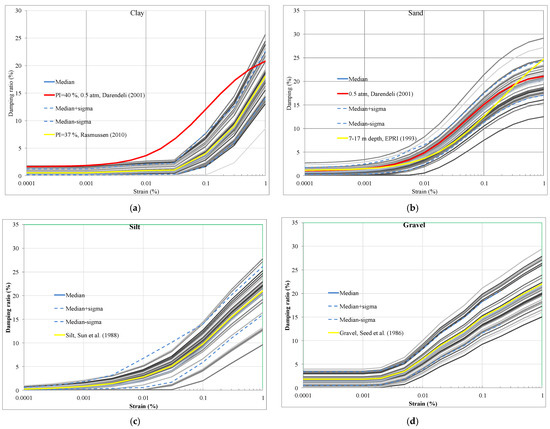 Thirty random damping ratio versus strain (%) curves for (a) clay, (b) sand, (c) silt, and (d) gravel. The curves in gray in the above figures are generated from the randomization.