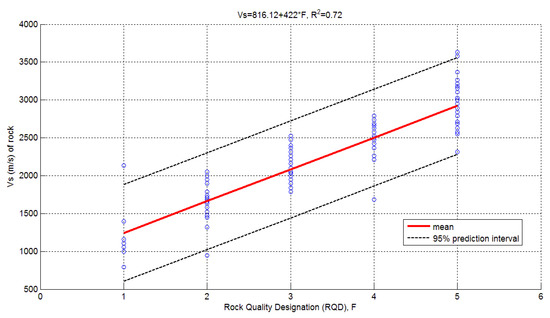 The rock quality designation is a standard parameter in drill core logging and is a leading indicator for low-quality rock zones [43]. Data on the rock shear wave velocity at various sites where the RQD was also available show a strong correlation between the two measures (Figure 9):
