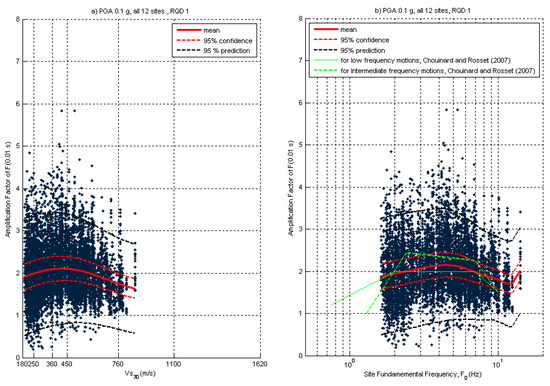 Amplification factors at T = 0.01 s for rock quality designation (RQD) of 1 (Vs = 1200 m/s) and PGA of 0.1 g: (a) as a function of Vs30, (b) as a function of site fundamental frequency F0.