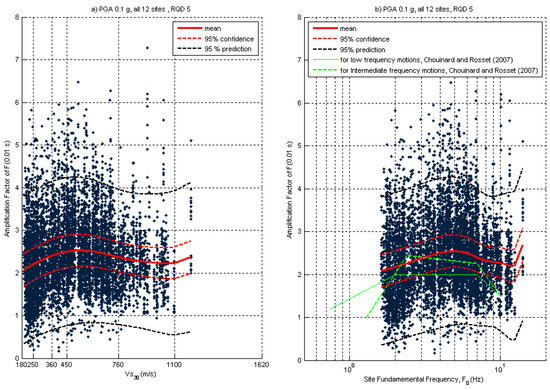 Figure 10, Figure 11 and Figure 12 show the amplification factor at low period (T = 0.01 s) as a function of Vs30 and site fundamental frequency F0 for different RQDs of 1, 3 and 5, and PGA of 0.1 g. Amplifications for other PGA values are provided in [47]. They are compared with those obtained previously by Chouinard and Rosset [48] and show good agreement. It is observed from Figure 10, Figure 11 and Figure 12 that for all 3 RQDs, a peak is observed in the non-linear relation between F(0.01 s) and Vs30 when Vs30 is in the range of 360–550 m/s.