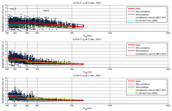 Amplification factors as a function of Vs30 for periods of (a) 0.2 s, (b) 0.5 s, and (c) 1.0 s (RQD = 1, PGA = 0.1 g).