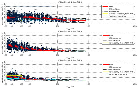 Amplification factors as a function of Vs30 for periods of (a) 0.2 s, (b) 0.5 s, and (c) 1.0 s (RQD = 3, PGA = 0.1 g).