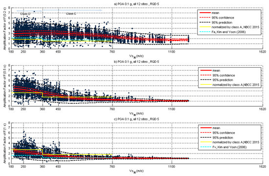 Amplification factors as a function of Vs30 for periods of (a) 0.2 s, (b) 0.5 s, and (c) 1.0 s (RQD = 5, PGA = 0.1 g).